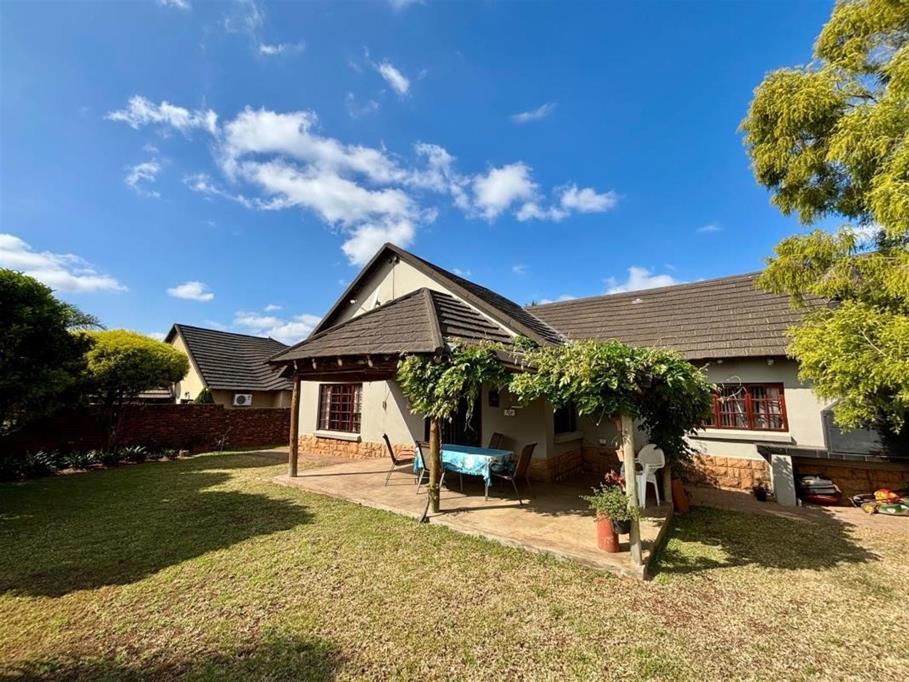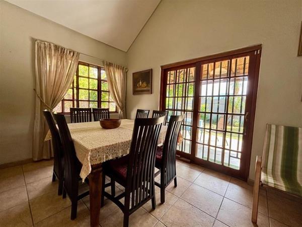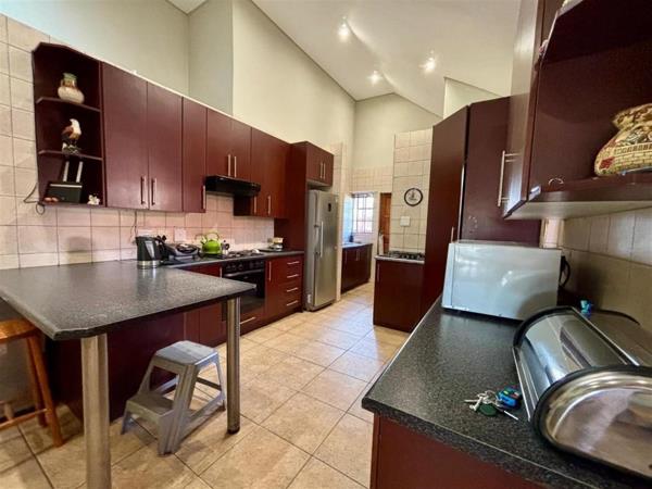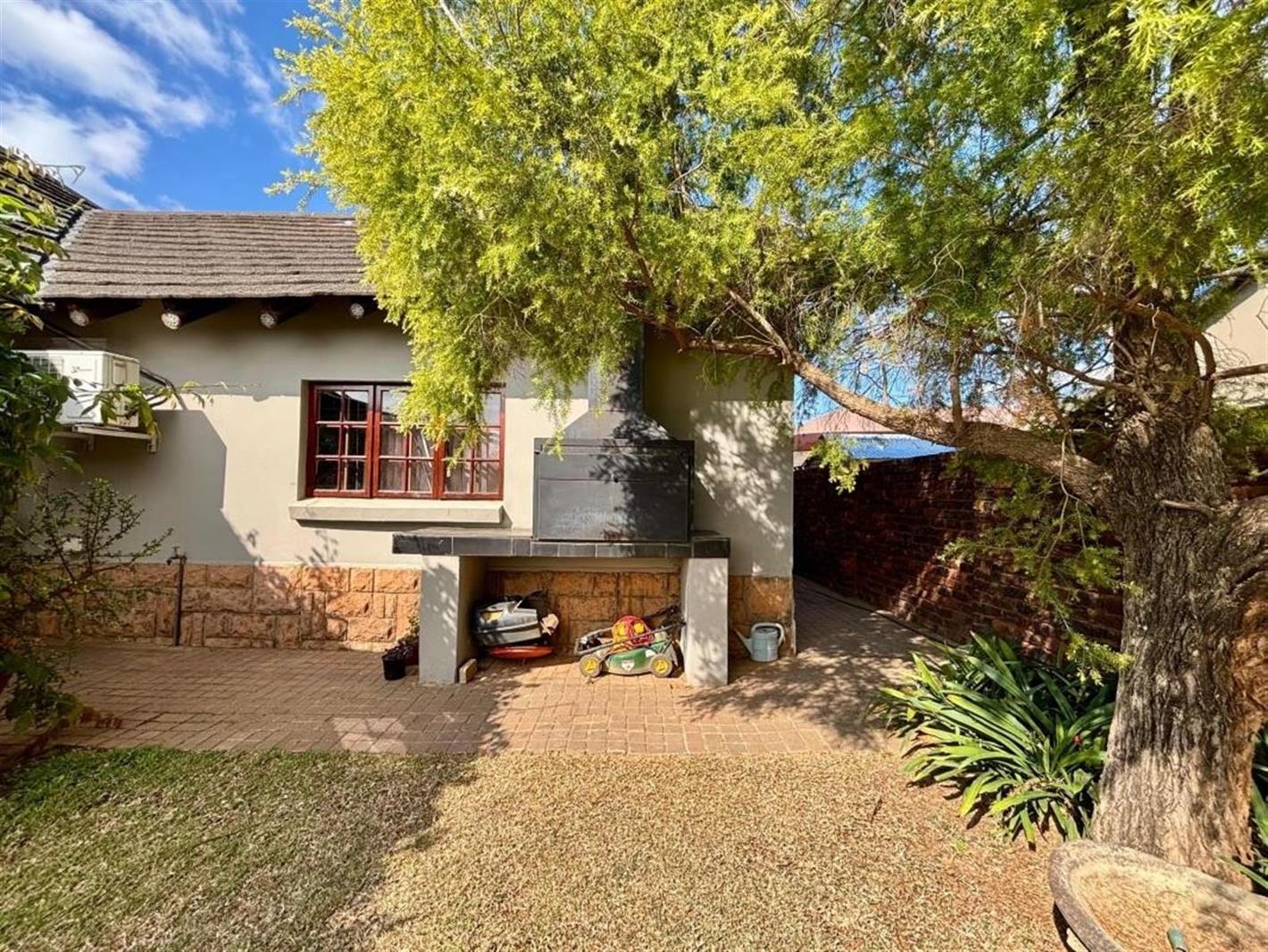 Inside, a generous open-plan design seamlessly connects the kitchen, dining, and living areas. The kitchen is both functional and stylish, boasting abundant cupboard space, a full undercounter oven, a hob, and an additional gas hob conveniently located near the pantry. A separate scullery allows for effortless access to the backyard. The air-conditioned living area opens through elegant French doors into a versatile dining zone or an enclosed, sunlit patio. This bright patio flows onto a thatch-covered stoop, leading to a private, pet-friendly garden complete with a built-in braaiperfect for relaxed outdoor gatherings.