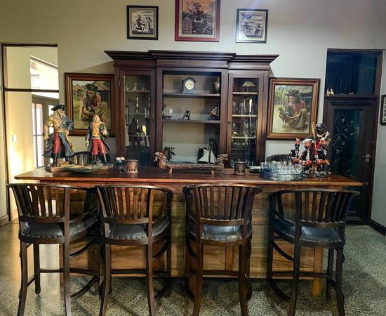 Lounge, Dining area, braai, bar, pizza oven, open fireplace.