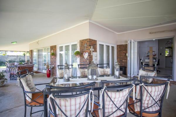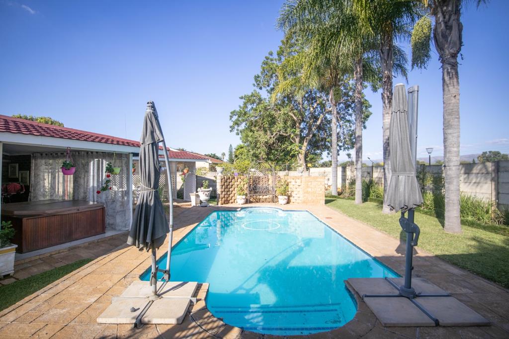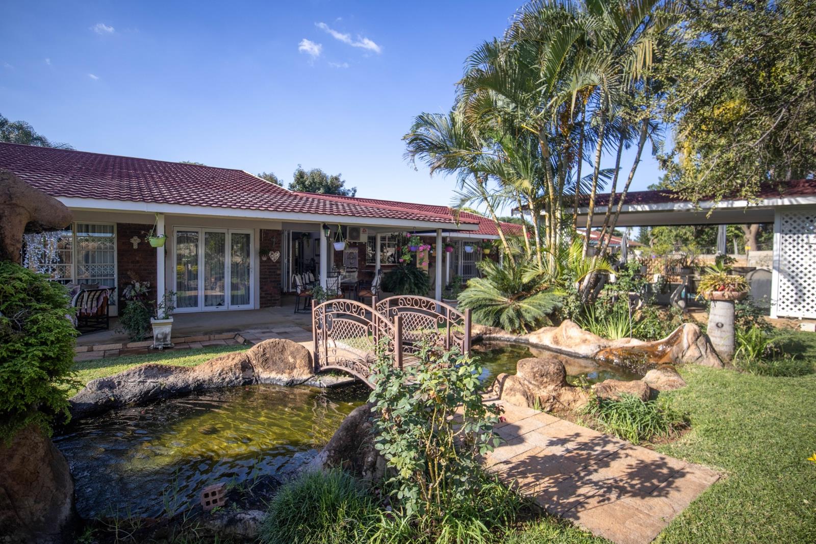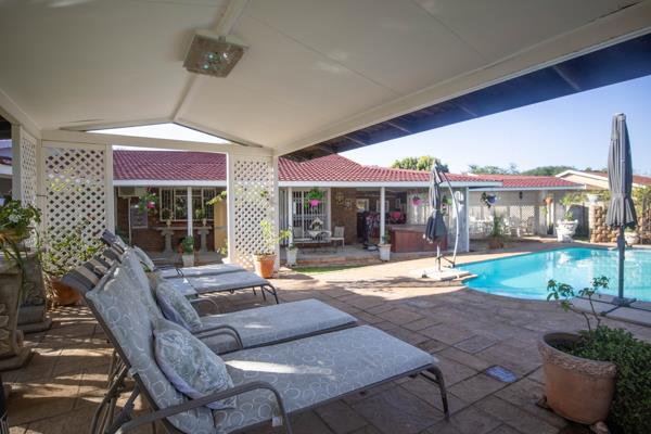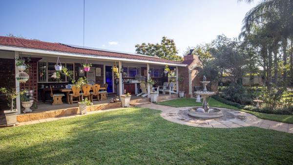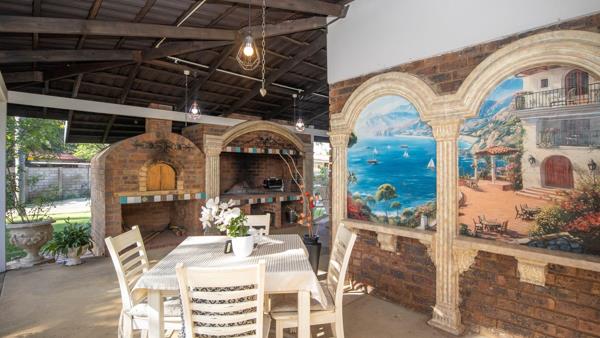 An Italian-inspired patio features a pizza oven, fireplace, and mural backdrop, wrapping around the home for seamless indoor-outdoor flow. The entire garden is manually irrigated via borehole, with two water tanks and dual pressure pumps.
