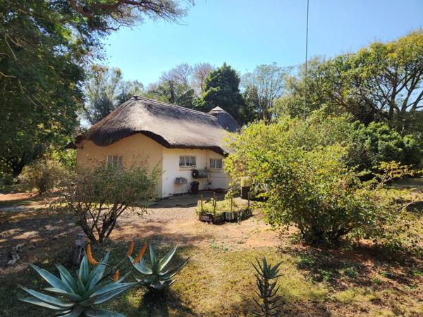 Elegant 200m thatched-roof farmhouse surrounded by a lush green garden, vibrant plants, and various fruit trees.