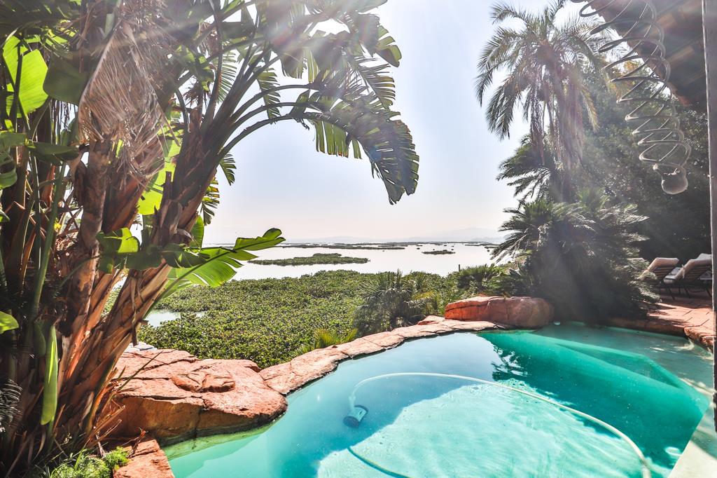 Waterfront double stand living at its best. Enter this sophisticated home through the peaceful courtyard and be captivated by the expansive views of the Hartbeespoort Dam and Magalies Mountains as a backdrop. Entertaining family and friends in this home will be carefree whether around the featured sunken bar or on the spacious covered patio with ceiling fans for the hotter days that can be enclosed with the remote powered roll down doors. Enjoy the sparkling pool and the ease of mooring your boat on the private jetty The open plan kitchen is spacious as is the separate scullery/laundry room. The west wing of the home features the master bedroom with en-suite full bathroom, a perfect work from home office, a TV lounge and second bedroom with full bathroom. The east wing features 2 bedrooms and a full bathroom, The 5th bedroom has a separate entrance with a full bathroom and could be used as a staff quarters. Some extras include Evaporative Cooling System, 2 double garages and plenty off -street parking. Call us today for a private viewing.