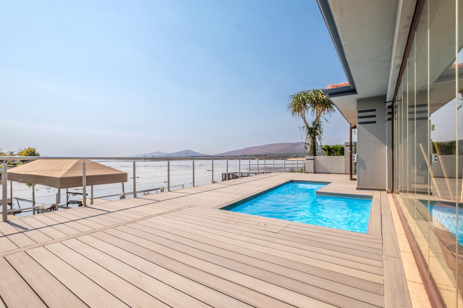 The special stacker doors, which open up onto the deck area overlooking the sparkling pool, giving panoramic views over the rolling Magaliesberg Mountains and the majestic Hartbeespoort dam with magical sunset views making this the ideal waterfront property and is perfectly positioned.
