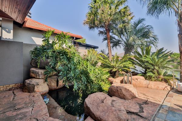 Welcome to life on the Hartbeespoort waterfront! A lovely private court yard entrance welcomes you to this waterfront property with a large open plan living area including a central built in bar, opening out through large sliding doors, to the solar heated rock pool & down to the lower terrace & private jetty on the waters edge. With a magnificent view of the Hartbeespoort Dam & the mountains. The raised, open plan kitchen accommodates an eyelevel oven, built in microwave & electric stove, granite tops & a separate scullery. Three ensuite bedrooms are accessed from inside the home & a fourth ensuite bedroom has a private entrance from the courtyard, ideal for guests, a study or domestic accommodation. The master bedroom has a large walk in dressing area & also accommodates a steam room/ shower. Additional features include: Ducted evaporative cooling system, ceiling fans, a solar geyser, 2KVA inverter, 3 garages plus a golfcart garage, Big Blue & Reverse osmosis water filter system