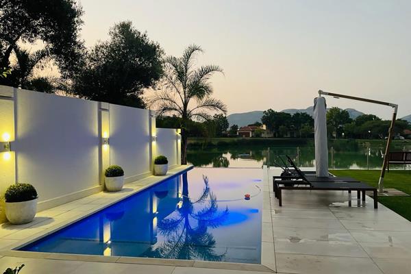 From the living areas, access is gained to the generous undercover patio boasting a gas braai, a 53 000L rim flow swimming pool, and a green space for children and pets to play. Revel in the ambiance while savouring a sundowner or morning coffee, with a captivating view of the inland lake and the majestic Magalies Mountains.