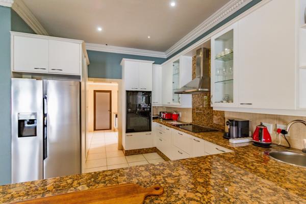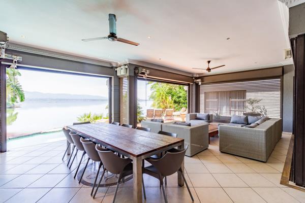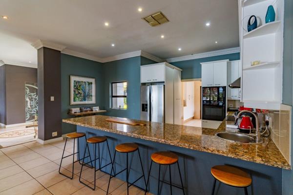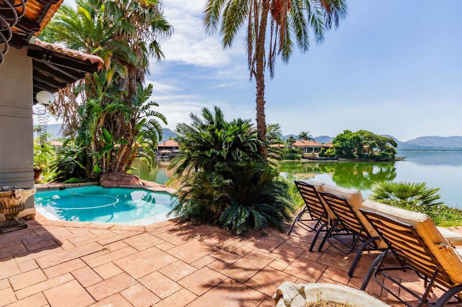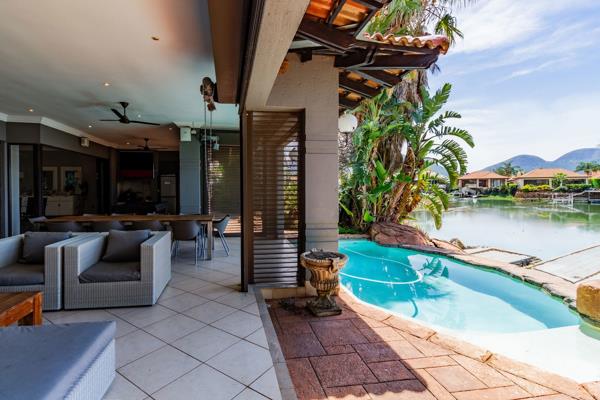 Spectacular Waterfront Living. Welcome to this exquisite gem within the sought-after Pecanwood Golf Estate. Enter into expansive open-plan living spaces with a central built-in bar, perfect for hosting gatherings with friends. The large enclosed patio offers ample space for relaxation, dining, and entertaining, all while enjoying panoramic views of the stunning Hartbeespoort Dam and Magalies Mountains. Take a refreshing dip in the splash pool to beat the summer heat. A gas fireplace in the living area and Breezair systems throughout ensure comfortable living year-round. The well-appointed kitchen, complete with a scullery, provides a practical yet elegant layout.