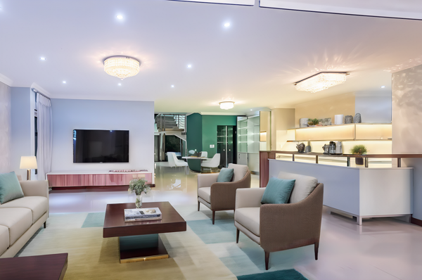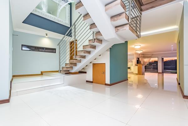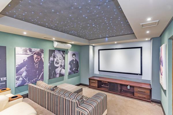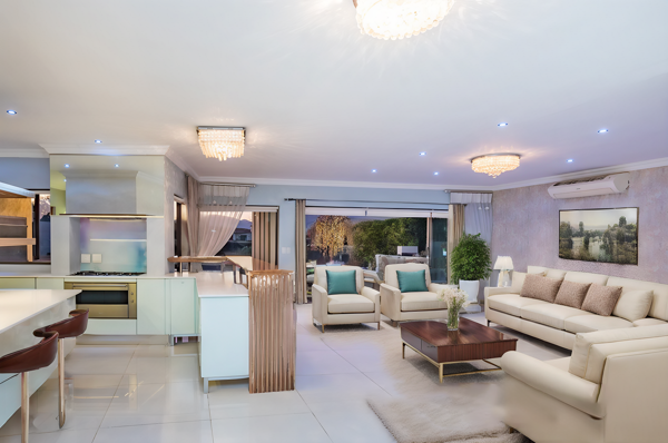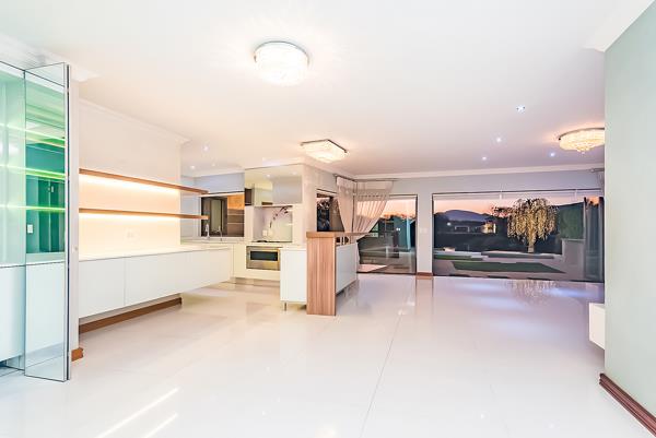 Exquisite genuine crystal chandeliers adorn focal areas of this beautiful home. The modern, upmarket finishes throughout & unique features complete this masterpiece. A well-appointed open plan kitchen with Smeg appliances, integrated fridge & a separate scullery. Open plan living area with discreetly placed bar & wine cellar. A cinema room with reclining chairs for those cosy family evenings. The covered patio has a built-in braai that opens out to the open-air entertainment area which is designed around the swimming pool & deck with a pizza oven, giving one the feeling of being on holiday at a resort.