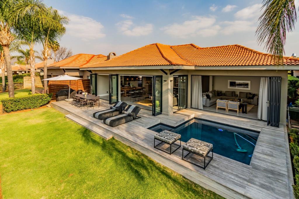 A private entrance down a beautiful walkway welcomes you to this ultra-modern home. The open-plan family room, lounge, dining room, and kitchen provide seamless access to the outdoor patio through sliding and stack doors. The living areas and patio feature a wooden deck surrounding a sparkling pool and garden, overlooking the calm Hartbeespoort Dam, majestic Magalies Mountains, and even a part of the golf course.
