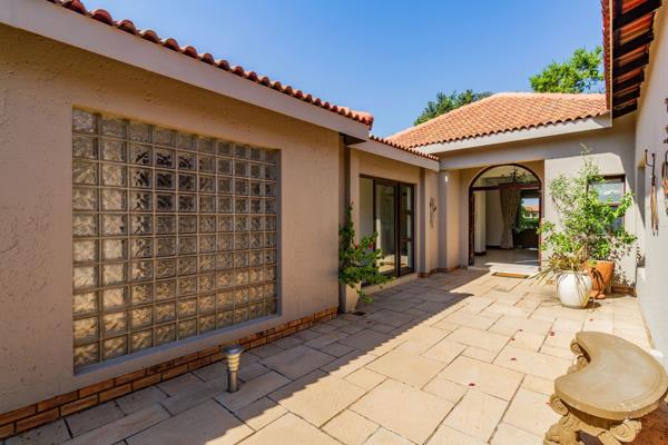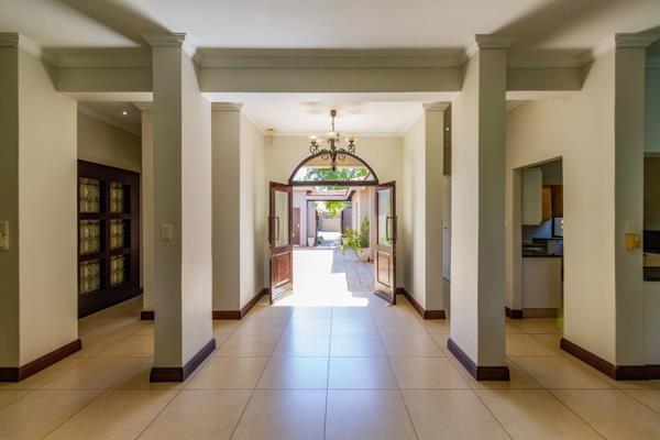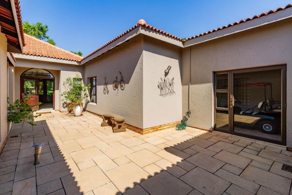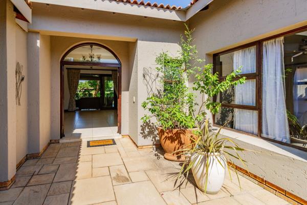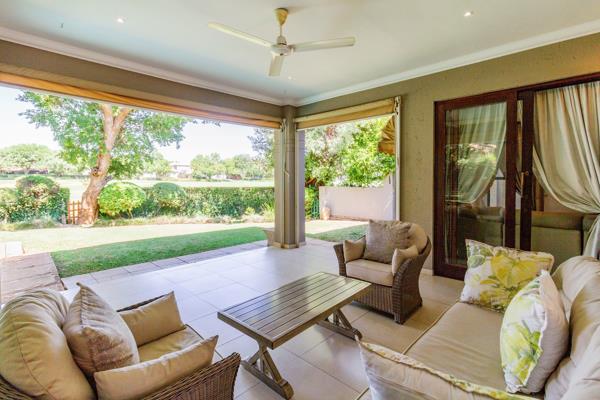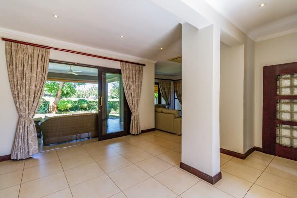 Private Oasis with Golf Access. Exclusive mandate. From the beautiful front entrance, this spacious family home does not fail to impress. Designed for effortless living and entertaining, the open-plan reception areas lead to a cosy undercover patio, complete with a built-in gas braai, perfect for year-round gatherings. With canvas awnings ensuring protection against the elements, this inviting space overlooks a sparkling swimming pool, creating an idyllic and relaxing setting.