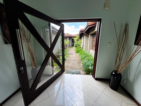 a lush tropical beautiful garden right from the entrance welcomes one to an beautiful big glass front door.
