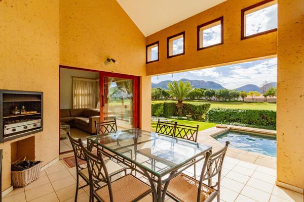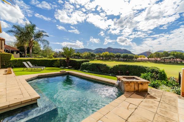 The living and dining areas blend seamlessly, sharing the comfort of a fireplace and air conditioning, creating the perfect setting for cosy winter evenings or summer get-togethers. Sliding doors open onto an expansive entertainment area, where the tranquil garden, sparkling pool and panoramic views create a backdrop of everyday magic. Gaze out over the prestigious golf course, the Magaliesberg Mountains, and catch a glimpse of the serene Hartbeespoort Dam.