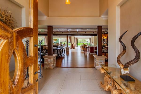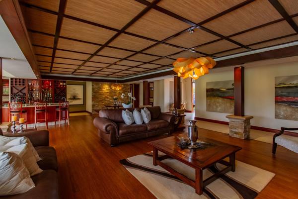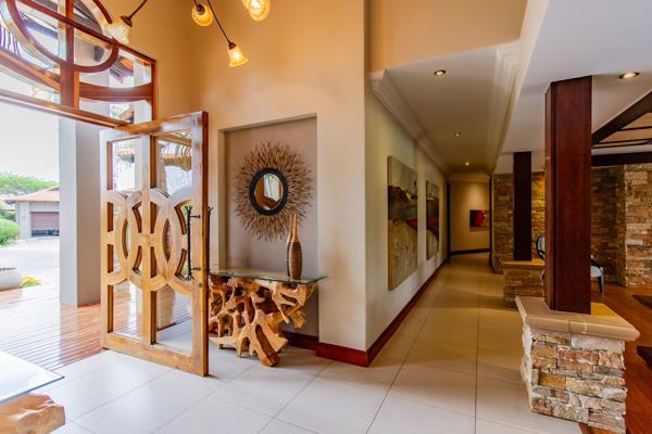 Expansive Double-Stand Family Home in Pecanwood. Stepping through the grand entrance, you are immediately drawn into an expansive home where high ceilings and abundant natural light create a sense of openness and calm. The open-plan living and dining areas was thoughtfully designed to flow effortlessly into each other while offering distinct spaces for everyday living and entertaining. Dark wood finishes in the living areas add warmth and refinement, complementing the airy, open interiors and creating a sense of understated elegance.