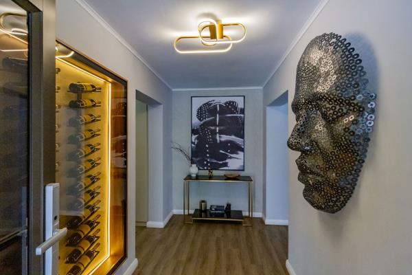 The entrance hall, complete with a striking LED-lit wine display, sets a sophisticated tone as you arrive. The home is designed with open-plan living in mind, where the dining and living areas flow with ease towards a covered patio, ideal for both relaxed family evenings and stylish entertaining. A wood-burning fireplace enhances the living room, while sliding doors invite you outside to enjoy the built-in braai, sparkling splash pool and expansive garden.