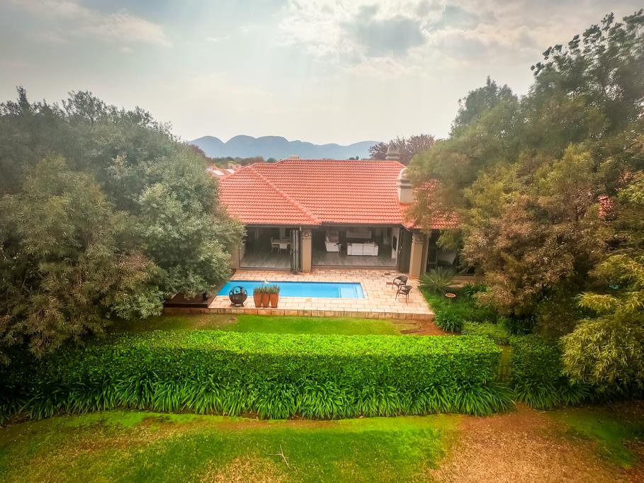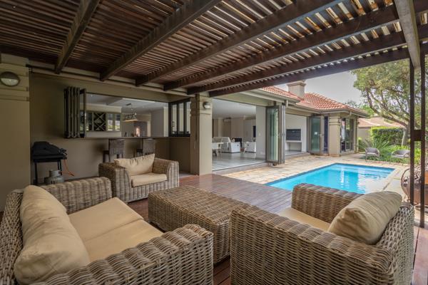 The living area & kitchen flows effortlessly to the covered patio with stacking doors, creating a natural flow between the indoor living space and outdoor entertainment area and pool. With a view over the garden and golf course making it the perfect setting for gatherings, family braais, or simply enjoying the outdoors from the comfort of your home.