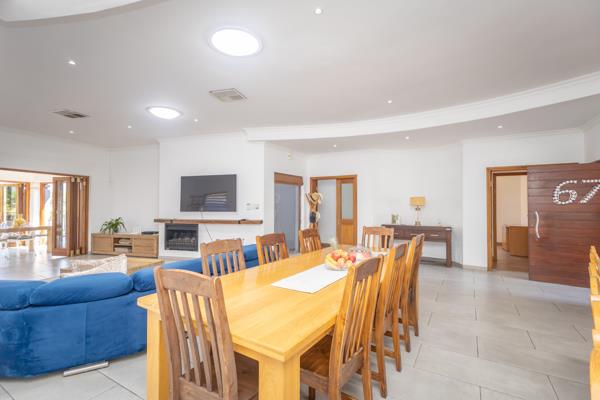 The heart of the home is a spacious light filled open-plan kitchen with a modern layout, granite counter tops, separate scullery and breakfast nook that flows effortlessly into the spacious open plan dining and living areas. Large windows and skylights invite in natural light, creating warm, airy spaces that embrace the surrounding beauty while offering uninterrupted views.