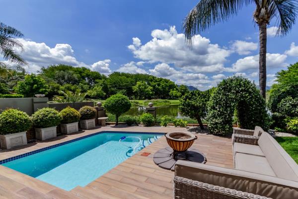 To the left, the centre of the home unfolds around the kitchen and dining area. The kitchen is thoughtfully designed with a centre island and generous counter space, inviting everyday cooking as much as relaxed gatherings. Your eye is naturally drawn outside, where the swimming pool, inland lake and the Magalies Mountain range create a changing, ever-present backdrop. Adjacent to the kitchen, the dining room includes a fitted bar and opens through stack doors to the covered entertainment patio. With blinds for privacy and ceiling fans for comfort, this space feels equally suited to long summer lunches or quieter evenings overlooking the water and mountains.