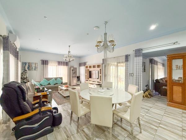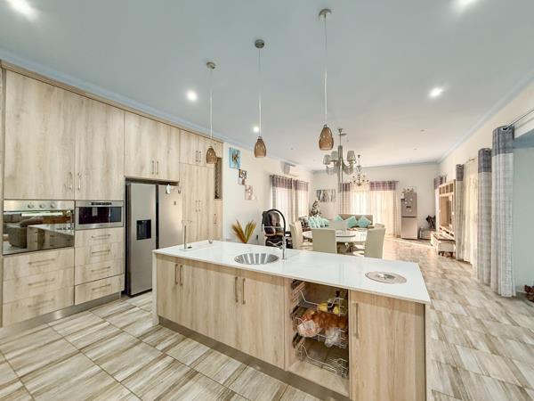 The home features three well-appointed bedrooms, with the main suite enjoying the privacy of a full en-suite bathroom. The remaining two bedrooms share a beautifully finished bathroom, ideal for children or guests. Expansive open-plan living areas are accentuated by tasteful finishes and an abundance of natural light, creating a warm and inviting atmosphere throughout. The generously sized kitchen is perfect for culinary enthusiasts, offering a modern layout with high-end finishes and a separate scullery for added convenience.