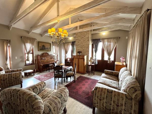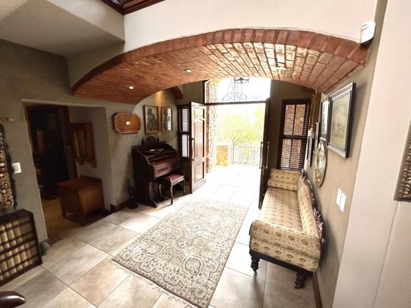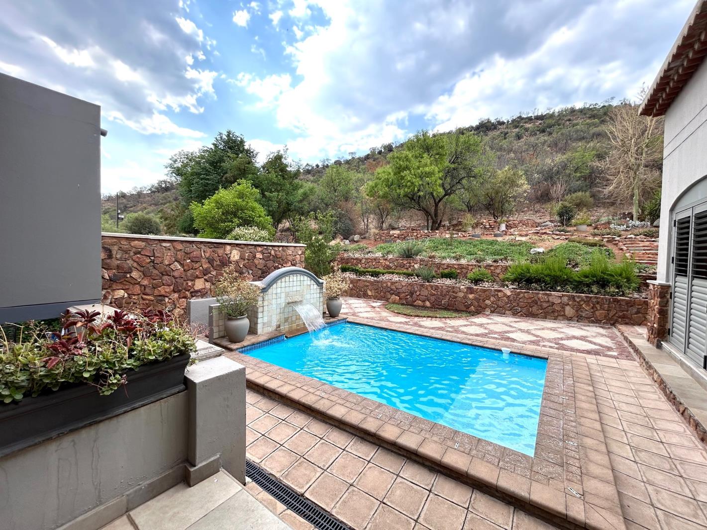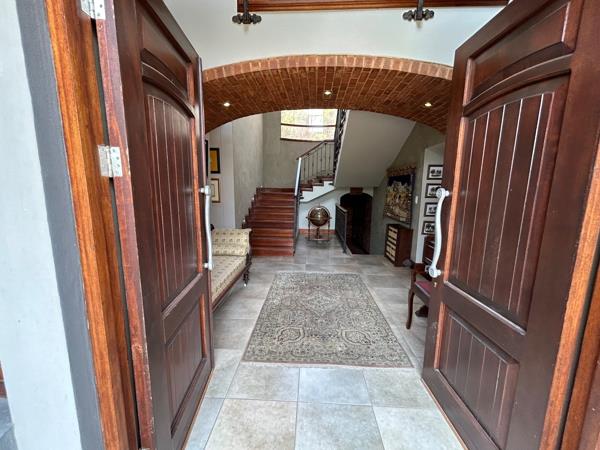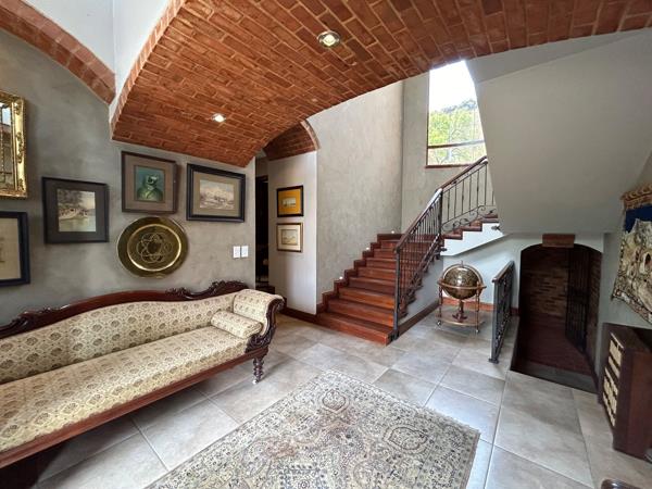 An impressive staircase leads to the upstairs generous main en-suite with a walk-in dressing room and private lounge area. The living areas are continuously flowing, creating open spaces for easy entertainment. The bespoke French kitchen also has a large scullery. The patio opens onto breathtaking mountain views. The spectacular pool and beautiful garden is ideal for exclusive outdoor entertainment and family fun. The house has a complete self-contained staff quarter and breeze air for those hot summer months.