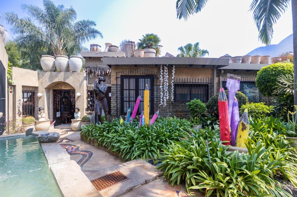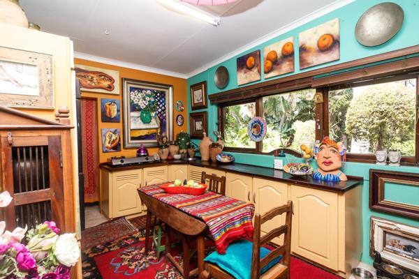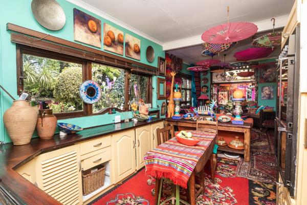 An exceptionally arty property set in a magical garden. The house comprises 6 bedrooms, 6 en-suite bathrooms, living area opens onto a delightful patio and pool. The main living area boasts an open plan kitchen, dining, lounge. All the bedrooms have private entry which makes this property unique and perfect for paying guests. The Property is currently used as a sought after guest house so each room has its own kitchenette, air conditioning and en -suite bathroom. A comprehensive solar system ensures consistent hot water and electricity, while the borehole supplies sufficient water to keep the garden in excellent condition. The lucky buyer will have the option to purchase the contents of five bedrooms as well as the business book separately.