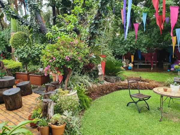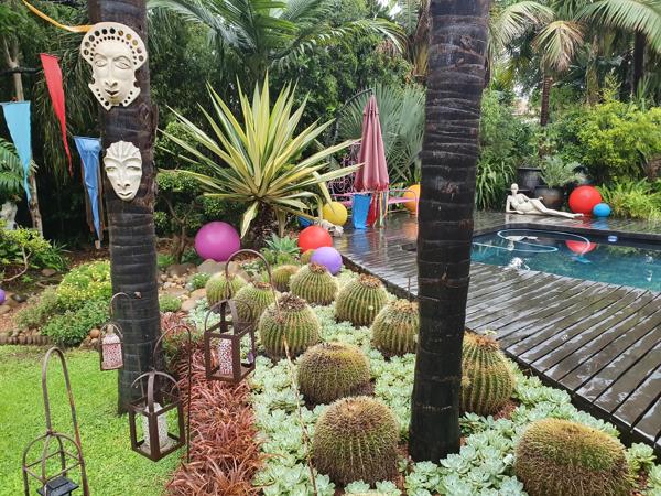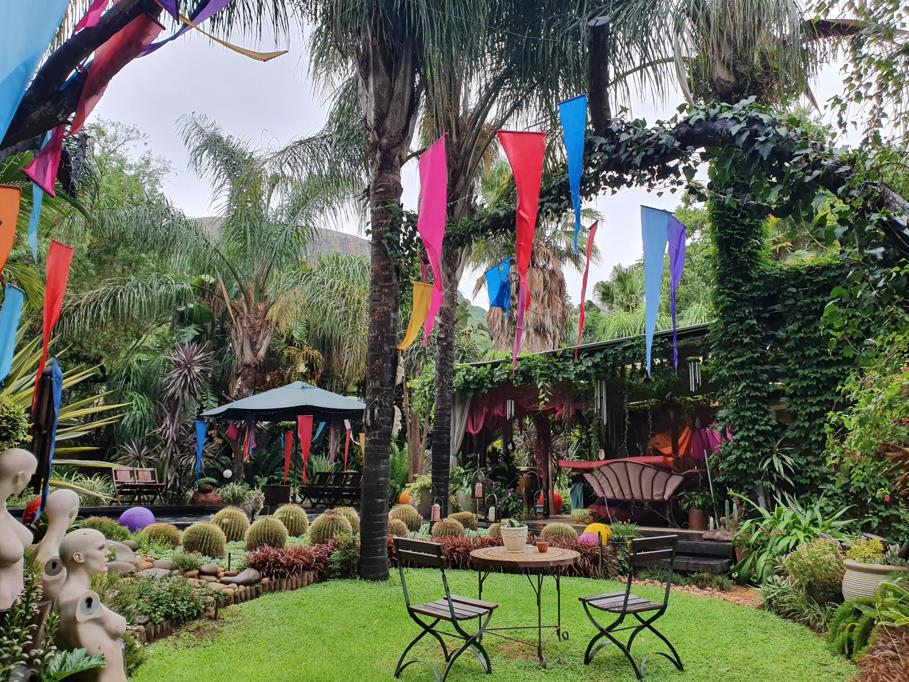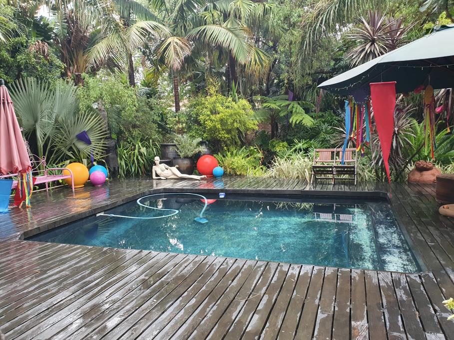 The guesthouse''s lush, evergreen garden feels like stepping into an artists vision come to life. Winding pathways lead to enchanting courtyards adorned with intricate sculptures and thoughtful landscaping. The centrepiece is a sparkling swimming pool set against a backdrop of a beautifully designed wooden deck, surrounded by vibrant flora and whimsical decorative elements.