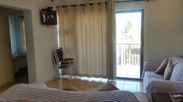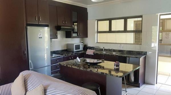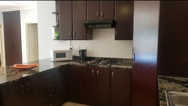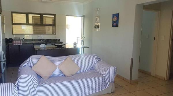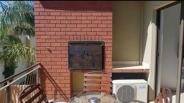 This beautiful apartment, has an open plan living area, large sliding door opening up onto the patio area with a built in braai .