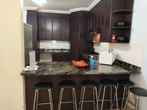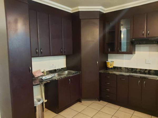 A lovely well sized kitchen, with beautiful built in cupboards, overlooking the open plan living area, leading to the patio with a built in braai & a lovely low maintenance garden.
