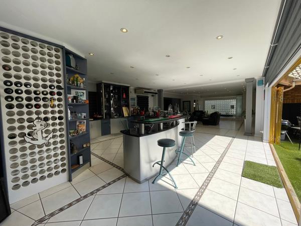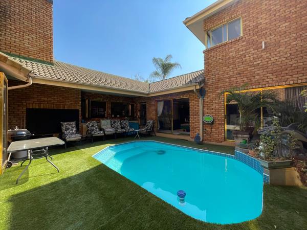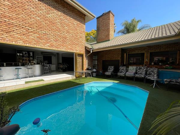 At the heart of this home is a unique swimming pool that serves as a stunning focal point, seamlessly integrating with various living spaces. You have the flexibility to choose between a heated pool for a relaxing dip on cooler days or a refreshing cold pool to cool off on warm summer days. Surrounded by artificial grass, the pool area features a large built-in braai and a spacious bar area with a built-in gas braai. The open-plan design ensures that the pool is visible from the large kitchen windows, enhancing the sense of space and connectivity.