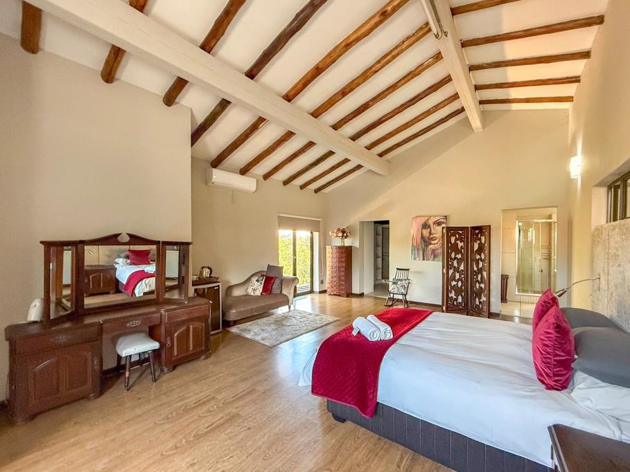 The home includes a newly renovated eighth bedroom with its own exterior entrance, a domestic room with shower, and two extra-length double garages that comfortably accommodate four or more vehicles. The lush, manicured garden is fed by a strong borehole, making this home completely self-sustainable and ideal for those seeking a greener lifestyle.