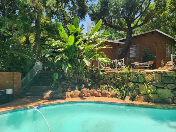 Step inside to a warm and inviting layout featuring a decent-sized open-plan kitchen, separate scullery and dining area, a separate lounge with a fireplace, and large windows that draw in natural light and a private courtyard leads to the expansive garden a rare find with terraces, established trees, and plenty of room for children.