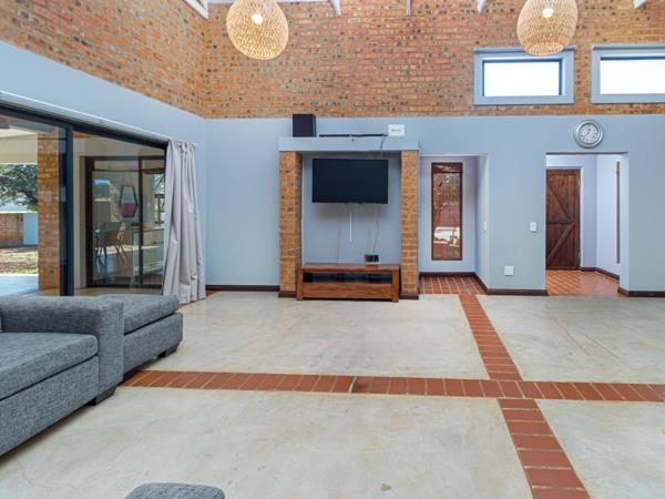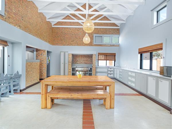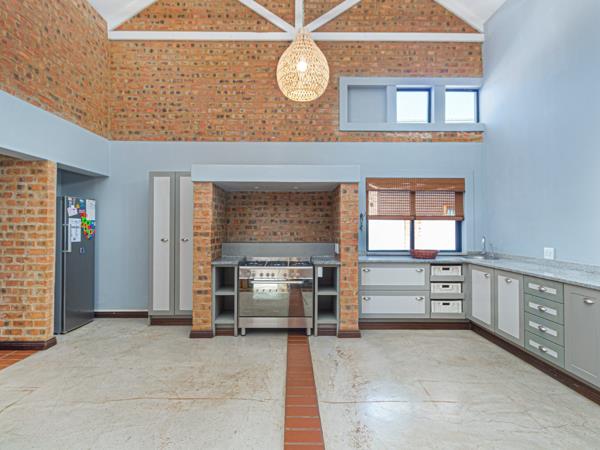 The open-plan living area seamlessly combines the lounge, dining room, and kitchen, creating an inviting space for family and friends. The kitchen boasts generous counter space, a gas stove, and a separate scullery with room for all your appliances. The lounge features a cozy wood-burning fireplace and sliding doors leading to the patio with a built-in braai ideal for year-round entertaining.