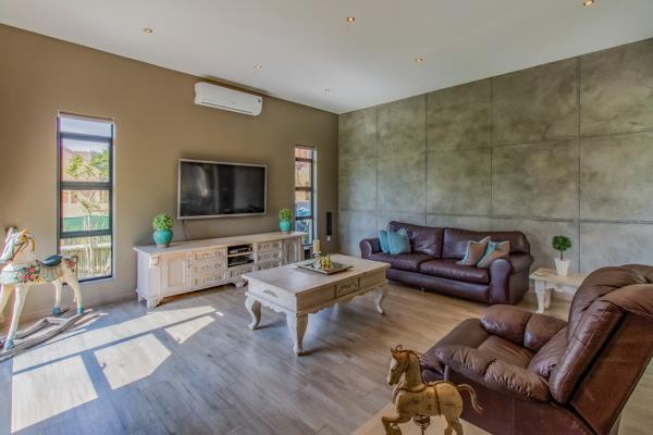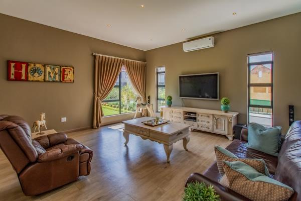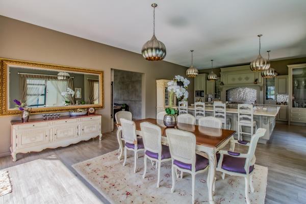 A large entrance hall leads to a reception area on the left, and living area on the right. The open-plan living area features a dining room and a beautiful, modern designer kitchen with a Bertazonni stove, a pantry and a scullery. A large farm door opens to a private lounge situated next to the dining room. The entertainment room has a built-in braai, a bar area and a lounge with big sliding doors opening to the patio and heated swimming pool. Additionally, the ground floor features a guest bedroom with an en-suite bathroom, as well as a study and a guest cloakroom.