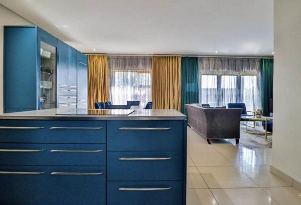 Ultra modern kitchen in blue with stainless steel tops. Appliances are all included.