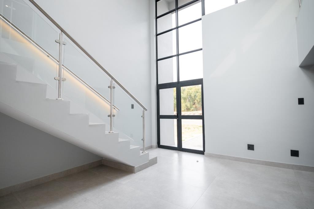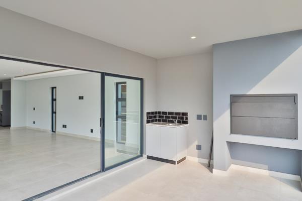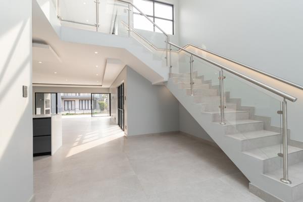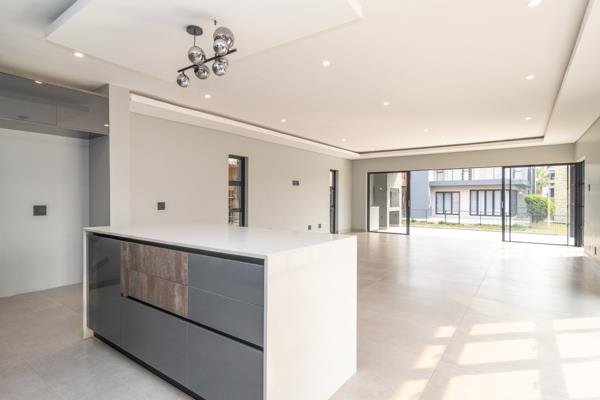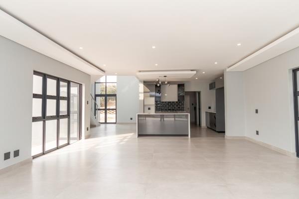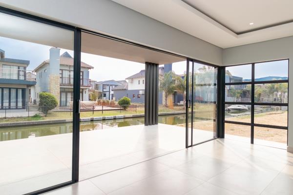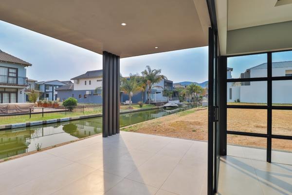This North-West facing residence spans 303m under roof, designed to embrace natural light, seamless flow, and sophisticated comfort. The home welcomes you with a double-volume entrance hall leading into expansive open-plan living areas, all extending effortlessly to an undercover patio with a built-in barbequeperfect for entertaining against the backdrop of tranquil water views. Clean architectural lines, generous glass and aluminium finishes, and high-end modern details define the interiors. At the heart of the home, the kitchen with a central island forms the focal point, connecting beautifully with the living spaces. A scullery and laundry ensure convenience, while a guest toilet and double automated garage complete the ground floor.