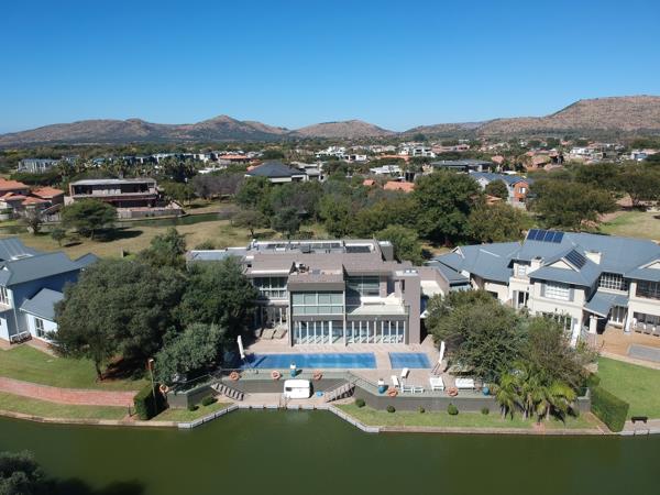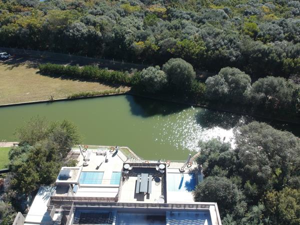 A home for the enthusiastic entertainer with a wine room adjacent to the kitchen and also a wine cooler and bar fridges by the dinging room. Upstairs leading onto a patio from the breathtaking pyjama lounge, overlooking the canal is another entertainment area with Braai and another kitchen with roll up cabinet for appliances including coffee machine and of course more bar fridges. Carrying on in a vertical direction you will take a spiral staircase to the top of the house and here is a sitting area with the most amazing views of the mountains. Back down to the pool which is heated with an electric cover and an adjacent jacuzzi pool you will find a concrete mosaiced bar overlooking the pool with a pizza oven and a champagne bar, and of course a boma.This property is on a canal across from trees. Yes, no onlooking neighbours!!!