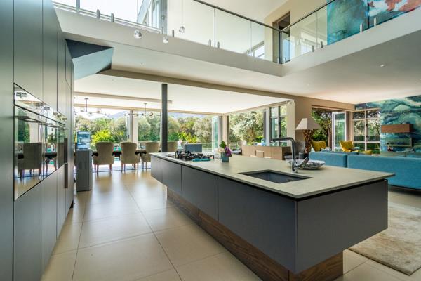 The centre of the home displays a gourmet kitchen with island featuring integrated Smeg appliances and several fridges.