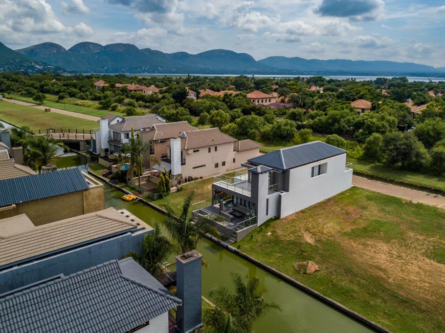 Nestled in the luxurious, private estate of The Islands situated on the south side of the popular Hartbeespoort Dam, lays this lovely 4 bedroom home. Built on two levels, the top of which is occupied solely by 3 bedrooms, 2 bathrooms and large wrap around balcony, this is a large home which will delight the whole family. The ground level contains 1 bedroom with en-suite bathroom, spacious entertaining area including a formal dining room adjacent to the open plan wood and granite kitchen. The entire living area opens up to the large patio with outstanding views of the surrounding idyllic countryside provide ample space for chilling.