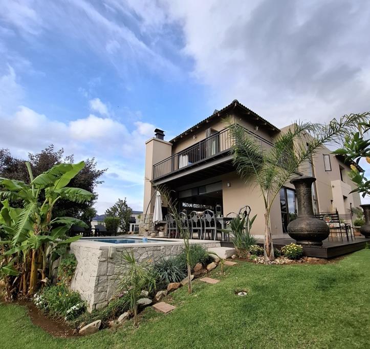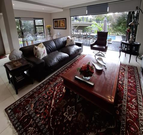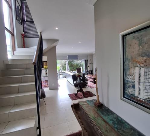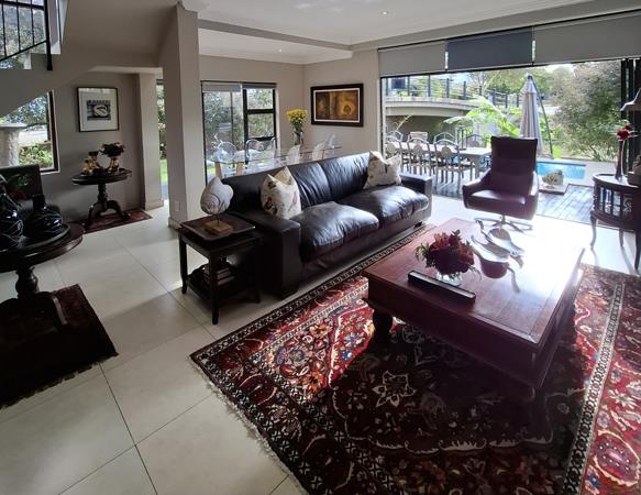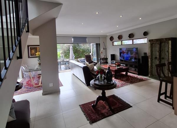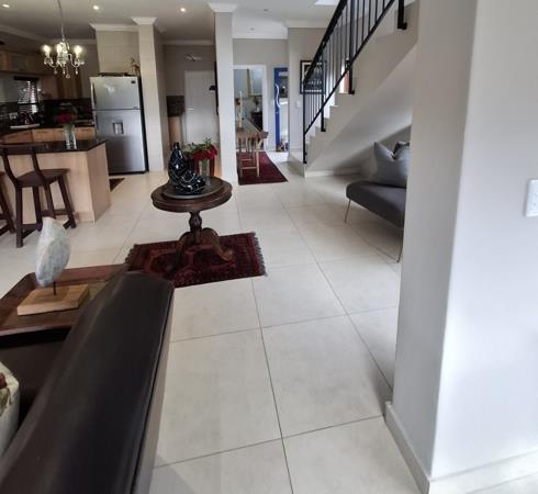 Downstairs is a spacious open plan living lounge, dining area, kitchen with scullery flowing to the outdoor area with a build in braai and patio next to the pool overlooking the Canal.