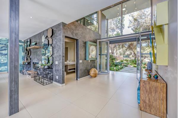 This property features a large inviting lounge with a cozy wood-burning fireplace and a vast open-plan dining area featuring a built-in braai to make entertaining effortless. The dining room opens to the outdoors, where youll find a mini jacuzzi pool and a long rectangular pool which sit side-by-side each other. Adjacent to the swimming pools sits a classic boma fire pit area perfect for social gatherings.