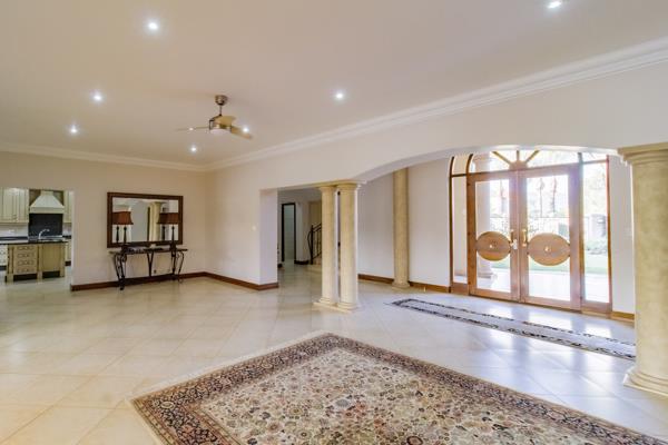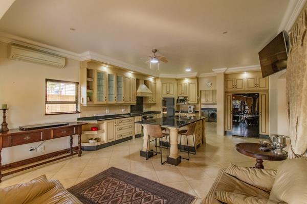 The dining room and fitted bar, also crafted from patrys wood, overlooks the pool and dam area. The lounge enjoys a fireplace with sliding doors leading to the entertainment area with a built-in braai. Stack doors open to the sparkling pool, overlooking the dam and Magalies Mountains.