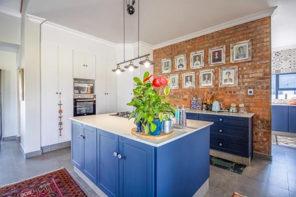 The kitchen features striking blue cabinetry, complemented by a separate scullery and laundry area. Warm, artistic finishes and boho-inspired touches add a distinctive personality throughout, giving the home a stylish yet grounded appeal.