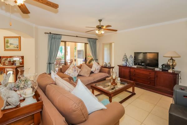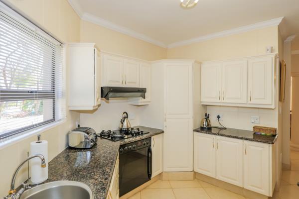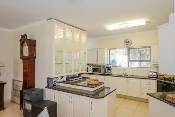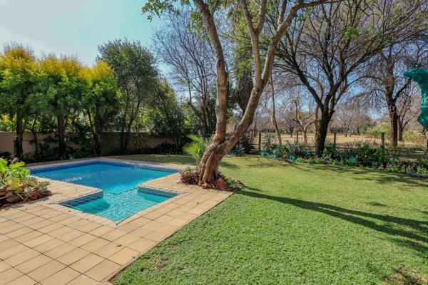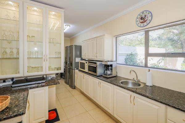 A beautiful open-plan living area is framed with sliding doors that lead to the outdoor entertainment area, pool and luscious lawn. If you enjoy cooking, this kitchen will satisfy your culinary needs with ample counter space, a scullery and a gas hob. The dining room and lounge enjoy natural light with a view of the garden.