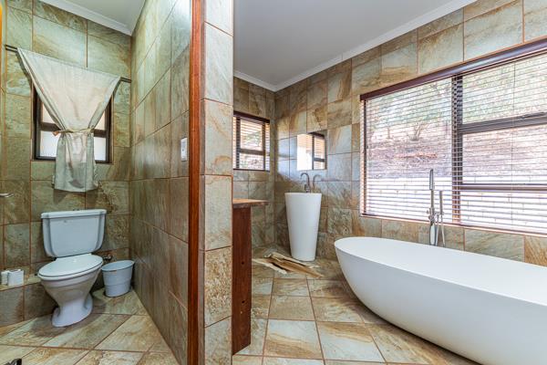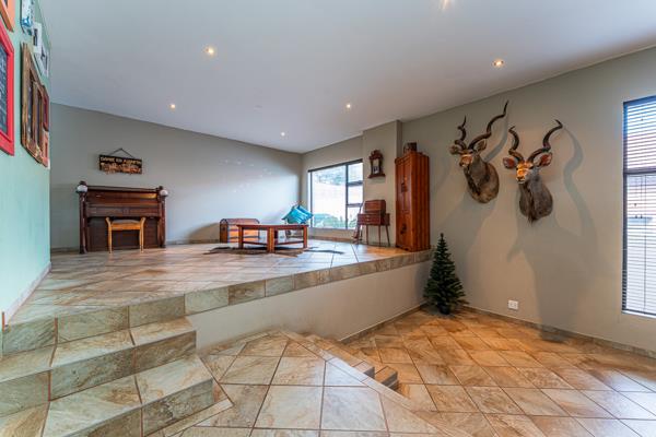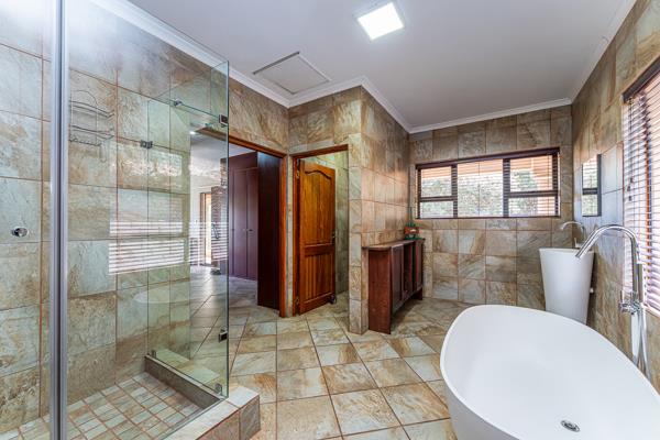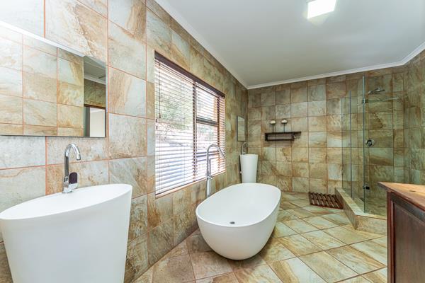 The main bedroom or flatlet is located downstairs. This huge room has a fireplace and air conditioning ensuring the enormous room is kept at the right temperature throughout the seasons. The flatlet has own kitchen and bathroom together with an enclosed stoep with built in braai and pizza oven. The unit is part of the house but also has its own entrance ensuring versatility for this phenomenal flat
