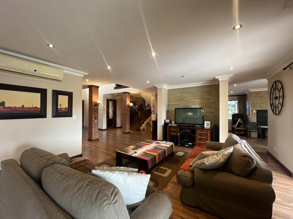 Upstairs, three expansive en-suite bedrooms await, along with a cozy pajama lounge and kitchenette leading to a balcony with stunning views. The master bedroom boasts a lavish double shower and basins, a separate loo, and a walk-in closet for unparalleled luxury. The lower level houses a sophisticated wine room, an en-suite bedroom with a kitchenette and office, and features high ceilings, expansive windows, and sustainable amenities, including water tanks, automated irrigation, and solar geysers. With three garages and ample space for a boat or caravan, this remarkable home awaits an exclusive appointment.