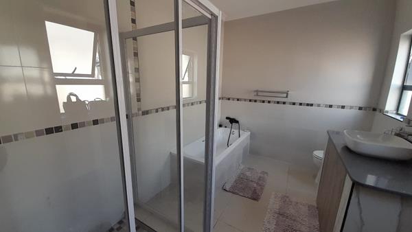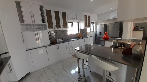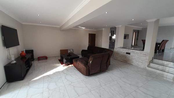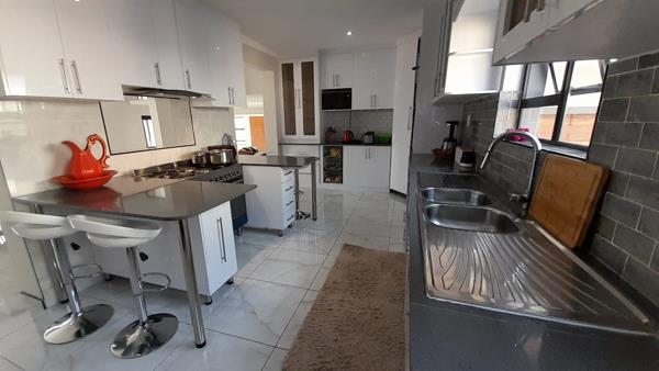 Surrounding the house is a well-maintained, modest garden with lush green grass, providing a serene outdoor space. The outdoor living areas are designed for both relaxation and entertainment, featuring a spacious patio. The property is also equipped with solar panels and a borehole, ensuring sustainable and reliable energy and water supply. Additionally, the property includes a double garage and ample parking space for guests and multiple vehicles.