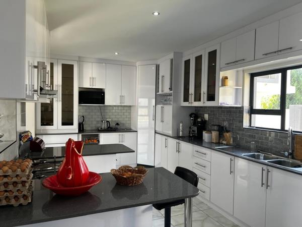 The ground floor boasts a spacious open-plan layout, ideal for entertaining and everyday living. The living and dining areas flow effortlessly onto a patio with a built-in braai, overlooking the inviting pool and garden perfect for relaxed weekends and family gatherings. The sleek, white gloss kitchen is well-equipped with a gas stove, ample cabinetry, and a separate scullery for added convenience.