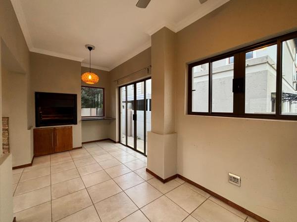 As you enter the residence, you are greeted by a welcoming entrance hall that leads to a spacious open-plan lounge and enclosed patio with a built-in braai that can be used as a dining area, perfect for both everyday living and entertaining.