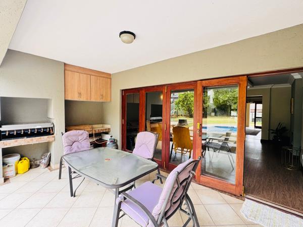 An additional private lounge or TV room provides a cozy retreat for movie nights and can easily be transformed into a fully equipped cinema room. The living areas open onto a spacious undercover patio with a built-in braai, ideal for outdoor entertaining, and overlook a sparkling pool that invites relaxation on warm summer days.