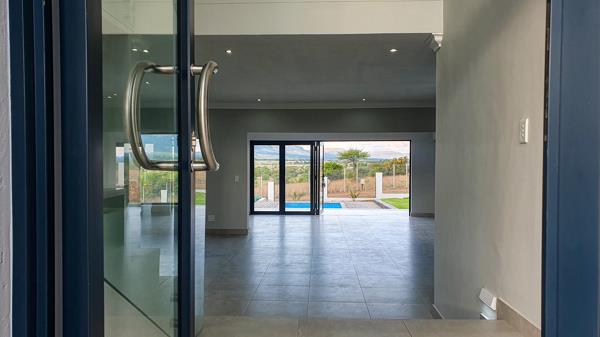 This modern open plan residence welcomes you with a spacious layout that flows seamlessly between the kitchen, dining and living areas, ideal for both relaxed family living and effortless entertaining. Large glass doors open to a covered patio overlooking a landscaped garden, allowing natural light to fill the space and offering beautiful estate views.