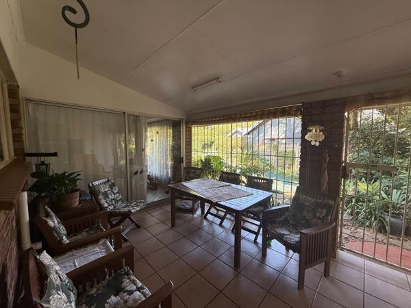 Sliding doors lead to a covered patio with a built-in braai, overlooking the swimming pool and garden an ideal setting for entertaining or relaxing with family and friends.