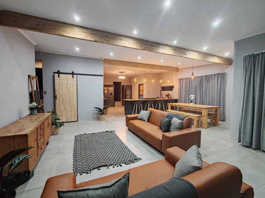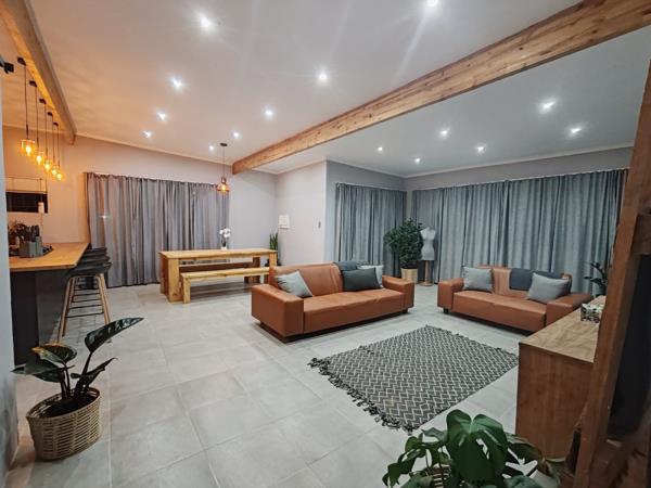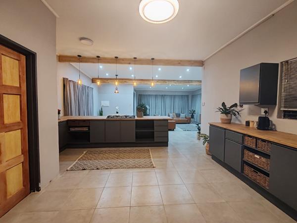 The heart of the home is the open-plan modern kitchen, finished with sleek grey tones and contemporary touches. A separate scullery keeps the main kitchen neat and functional, while the seamless flow into the living areas creates an inviting space perfect for entertaining and everyday living. A second kitchen provides the ideal setup for hosting and catering, making gatherings effortless and enjoyable. A separate domestic bathroom adds further convenience.