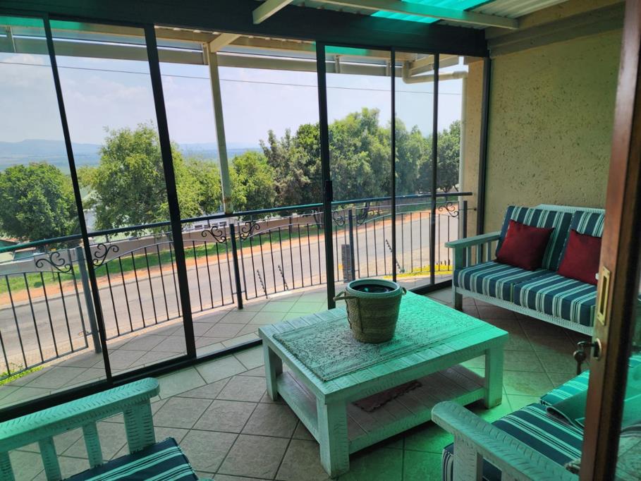 Discover this inviting 3-bedroom, 2-bathroom home set within the secure Kosmos Ridge estate in Hartbeespoort. The property offers excellent kerb appeal with distinctive architecture, wrought-iron railings, a paved brick driveway, and a beautifully maintained tropical garden. Inside, generous living areas include two lounges, a dining room, and a family TV room, all tiled and enhanced by crown moulding, large windows, and a cosy fireplace. An enclosed veranda captures panoramic views of the treed surroundings and distant hills, ideal for relaxing or entertaining.